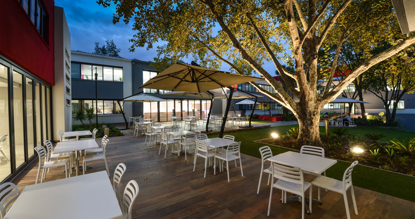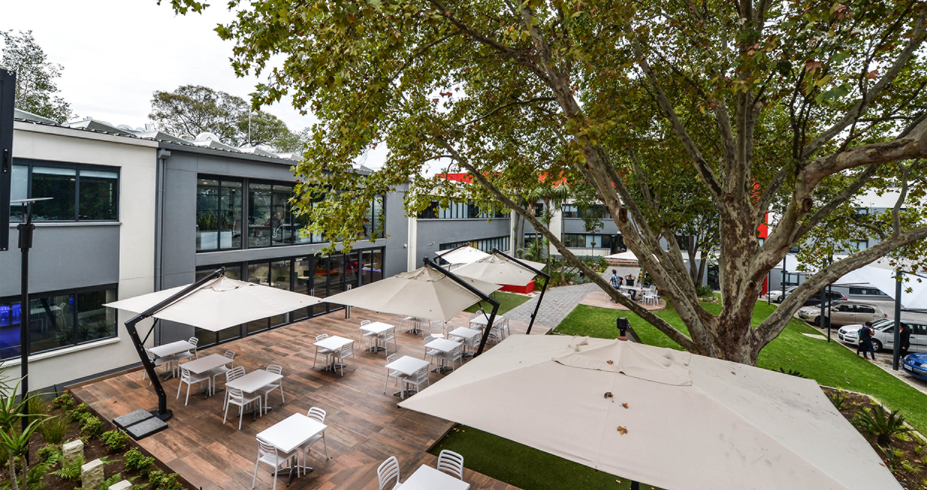 Afrihost required the complete redevelopment of an existing office building into a new head office for its fastgrowing internet company, incorporating all technical requirements and reinforcing strong branding and a corporate identity. The new offices are state-of-the-art in keeping with the company ethos. A strong focus on the end-user formed the basis for the design brief. Many sustainable initiatives such as rain water harvesting, solar geysers, photo-voltaic panels for +/- 50 % power usage and re-use/adaption of the existing structure have been incorporated into the redevelopment of the building. Mature trees were incorporated into the new lush landscaping. In addition to the exterior architectural design, KMH was appointed for the complete interior design together with the Afrihost team. Bespoke furniture complements the branding and design efficiencies across all aspects of the business – offices for the management and staff, a call centre, a client services centre, a staff gym, recreational area and a canteen.
