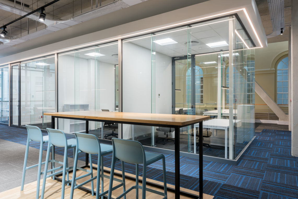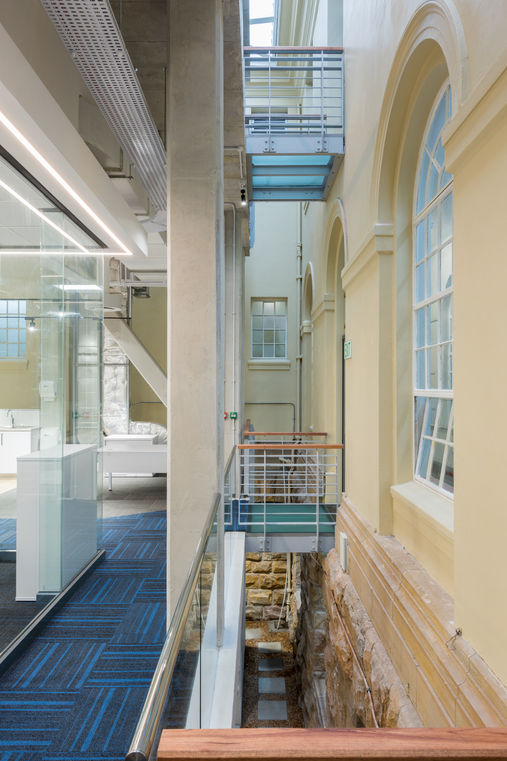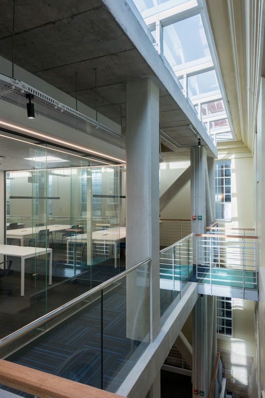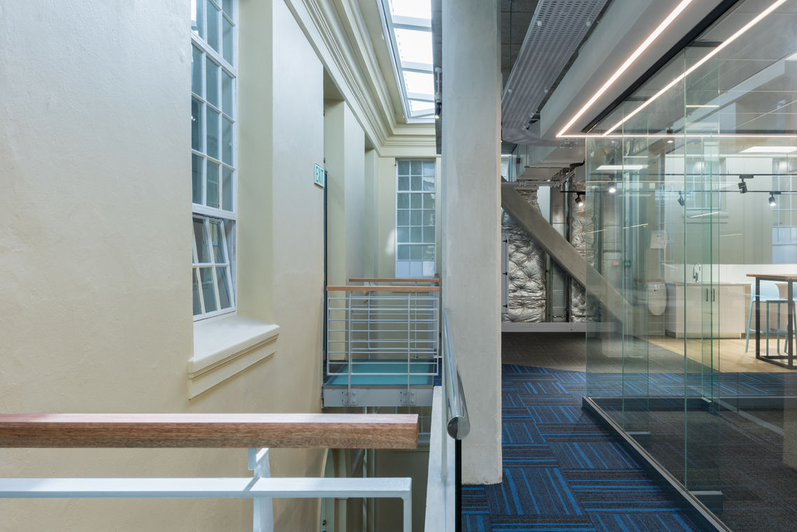 The infills were built in the existing courtyards between the three wings of the renowned Wernher Beit Building thus integrating the intervention modestly between the existing heritage wings. The two new freestanding buildings consist of a lower ground containing specialised laboratory spaces and two upper floors of open plan and individual research offices. The design allows for the open plan office spaces to surround a central spine of cellular offices and meeting rooms contained by glass walls. This design solution places emphasis on transparency and the visual connection to the beautiful surrounding heritage building. Furthering this principle are the floating steel and glass bridges crossing a skylight lit triple volume between the old and new. By using contemporary building materials to very lightly connect to the heritage façade, an ongoing dialog between the modern infill and heritage structures is initiated. Each office floor is completely furnished and follows a carefully considered interior design ethos to accommodate the demands of higher learning and modern research with flexible spaces and furniture solutions.